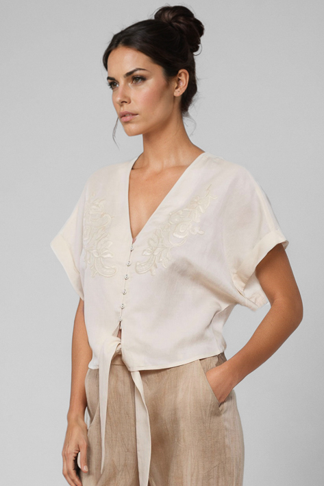 Blusa de lino con bordado floral.