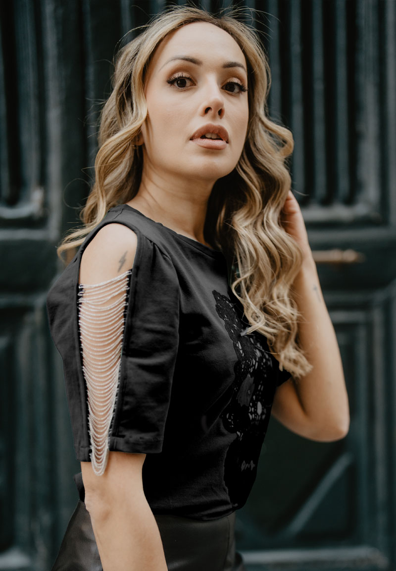 Camiseta de manga tres cuartos, con calavera de terciopelo. Abertura en los hombros: la manga se une por pequeñas y delicadas cadenas.
