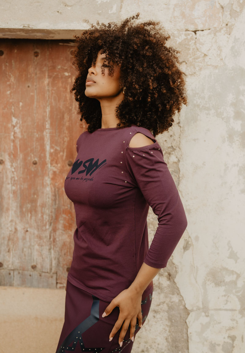 Camiseta entallada de manga francesa. Aberturas en los hombros y pequeñas tachuelas doradas rodeándolas. Escote posterior pronunciado.