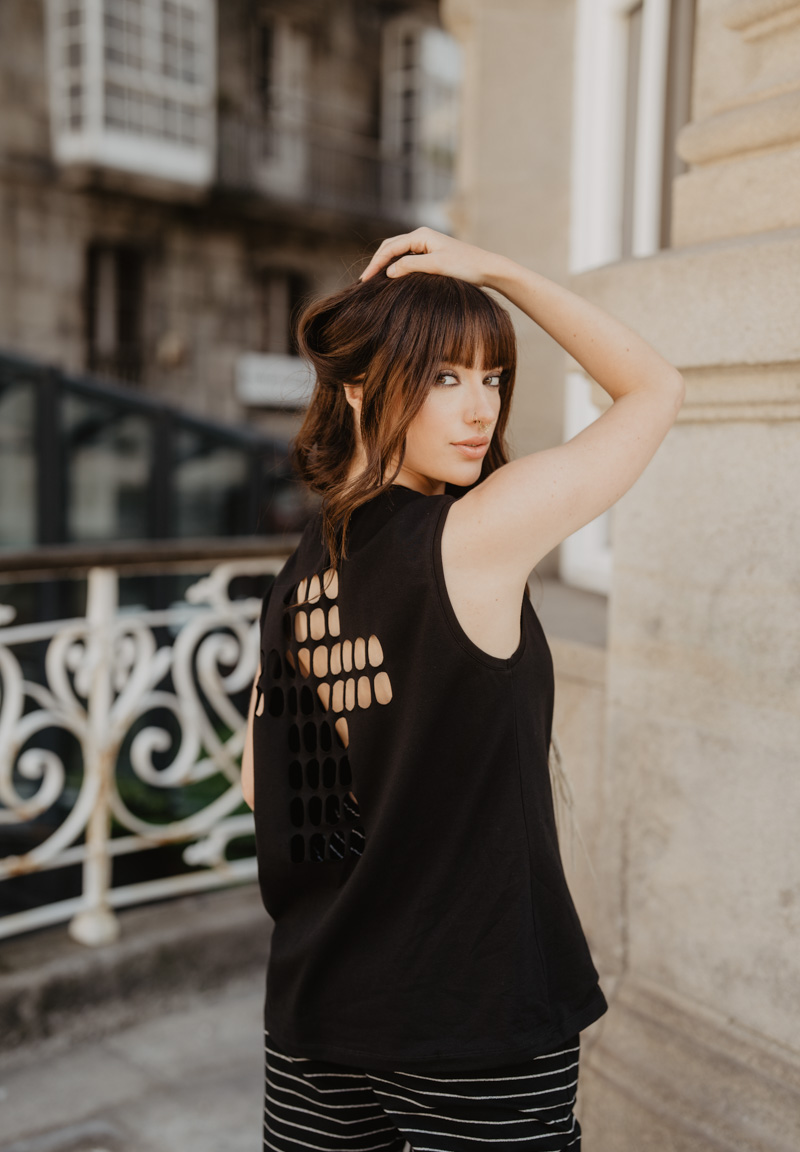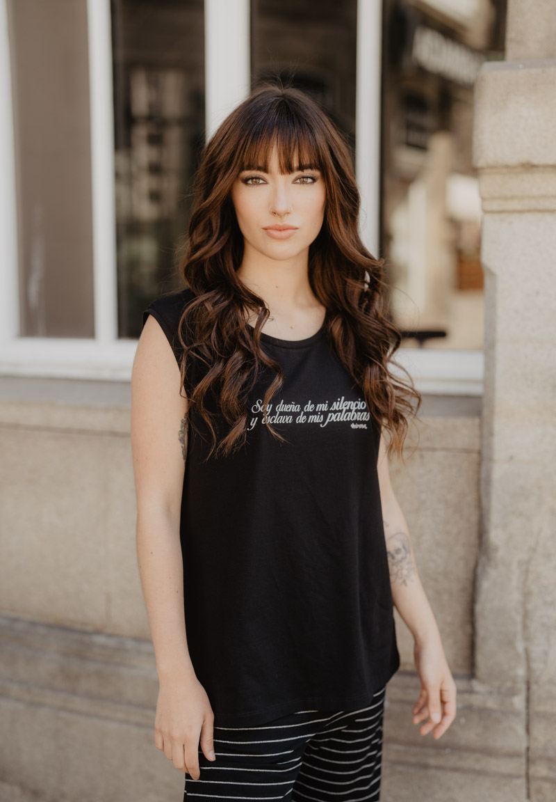 Camiseta negra con aberturas en la espalda formando una cruz. En el delantero, la frase «soy dueña de mi silencio y esclava de mis palabras» en glitter plateado.