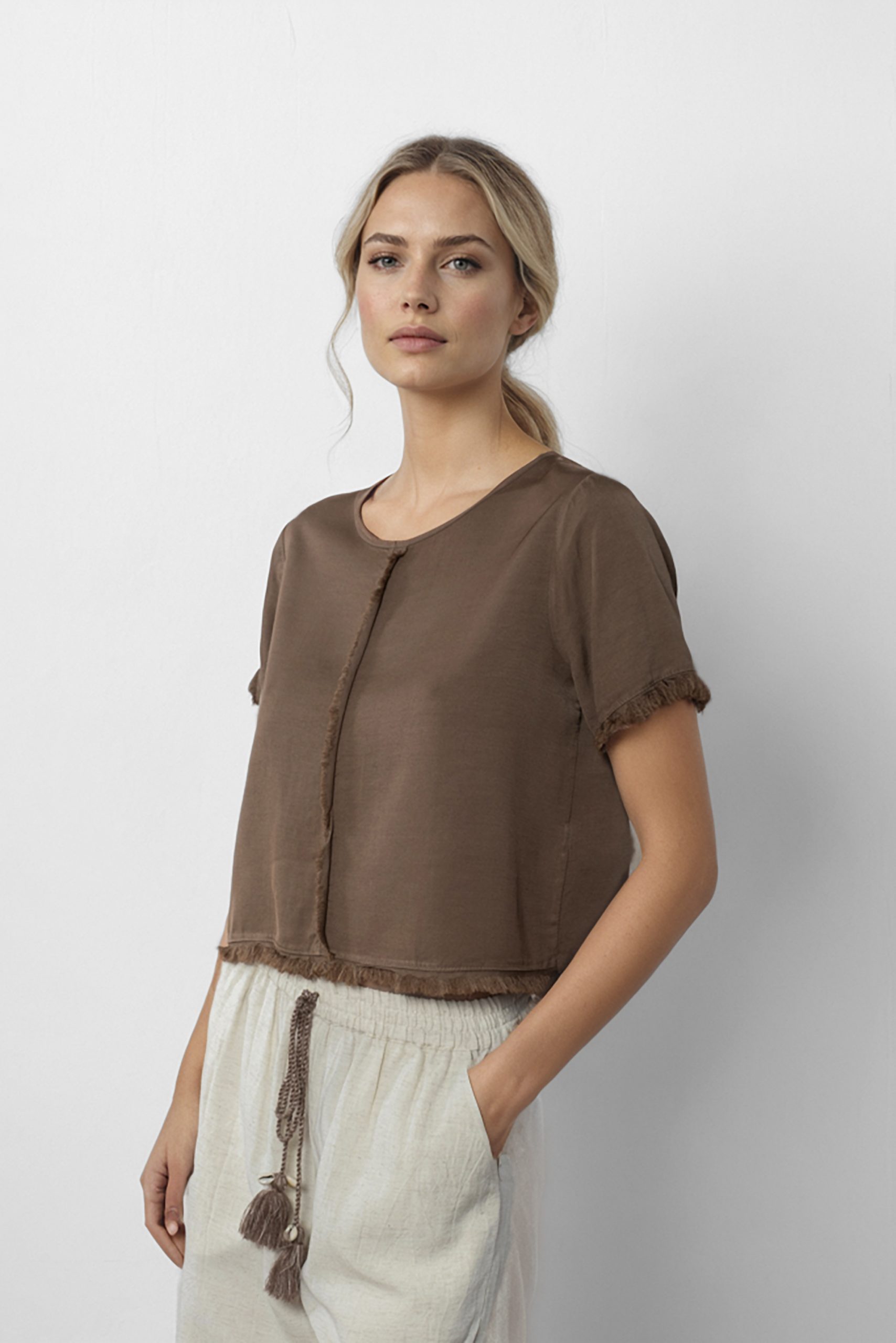 Camiseta manga corta con flecos .