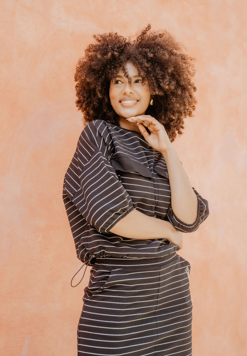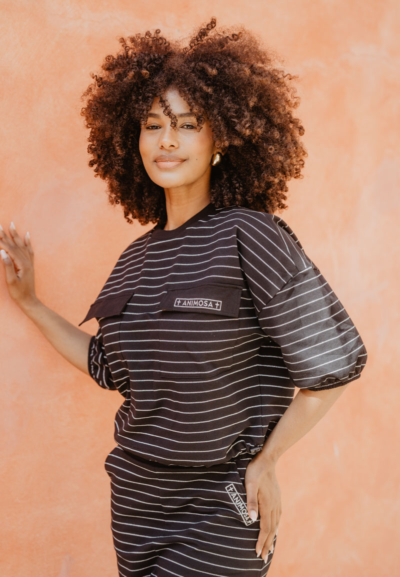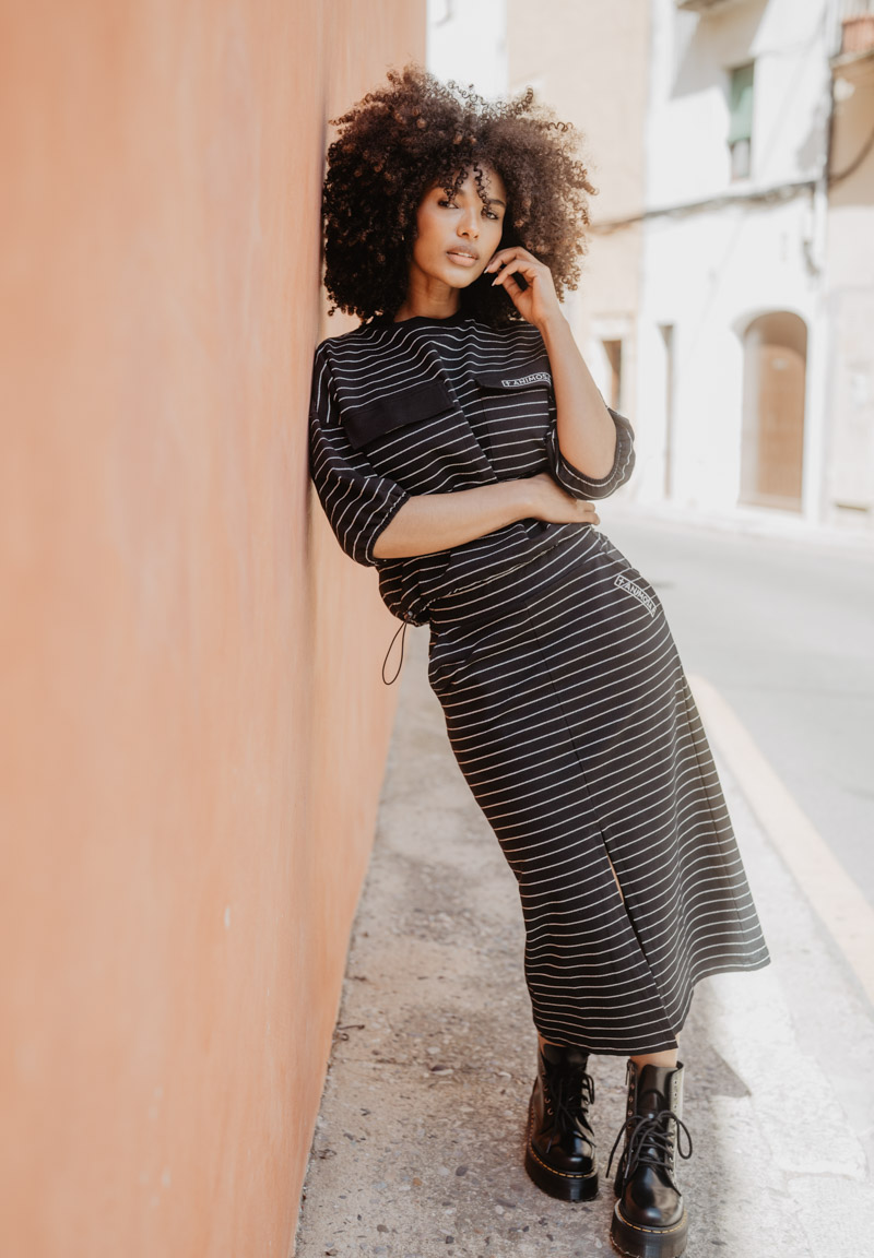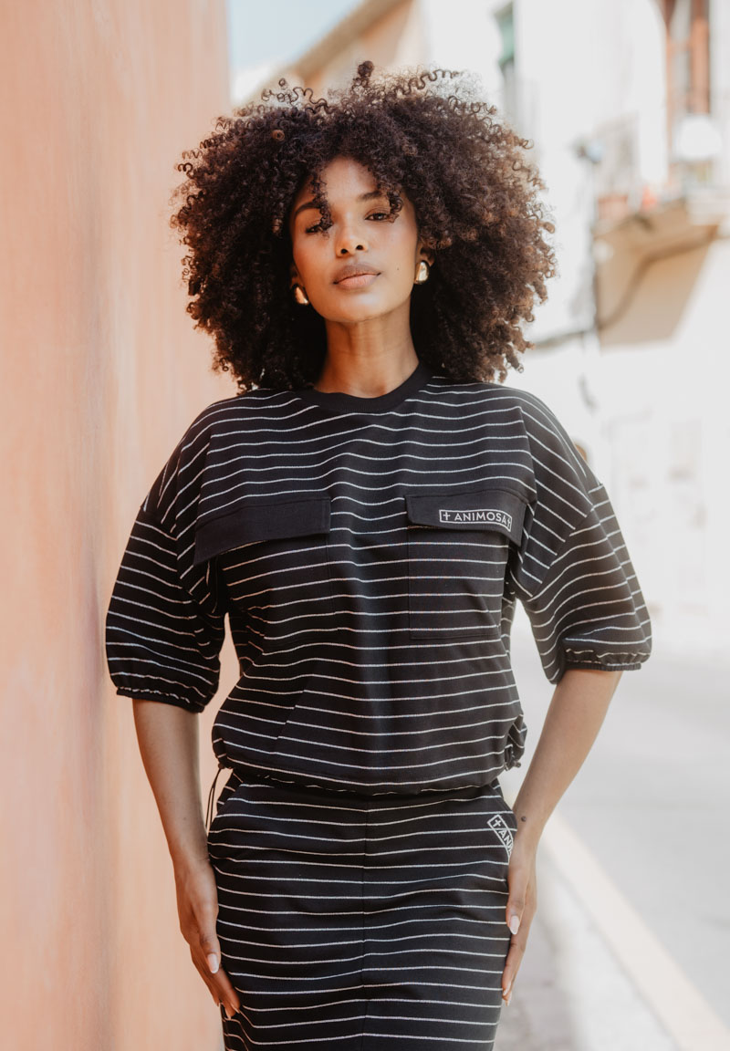 Sudadera de rayas plateadas, manga francesa con bajo ajustable. Bolsillo con tapeta.En uno de los bolsillos lleva bordada la palabra Animosa. .Inspirada en Juana .