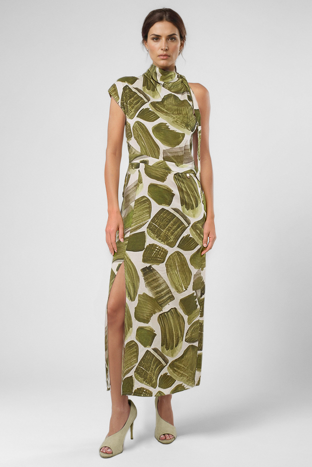 Detalle asimétrico: El cuello alto y la estructura del hombro añaden un punto de interés arquitectónico, refinando la línea del escote con una elegancia moderna.